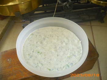 300g griech. Sahnejoghurt (oder normaler Joghurt über Nacht abgetropft), 1 Salatgurke (fein raspeln und das Wasser mehrmals ausdrücken) , 2-3 mit Salz geriebene Knoblauchzehen, 1 handvoll Dill, 1 Spritzer Zitronensaft, 1EL Olivenöl, 1EL weißer Balsamico, Salz und Pfeffer,1 TL Zucker