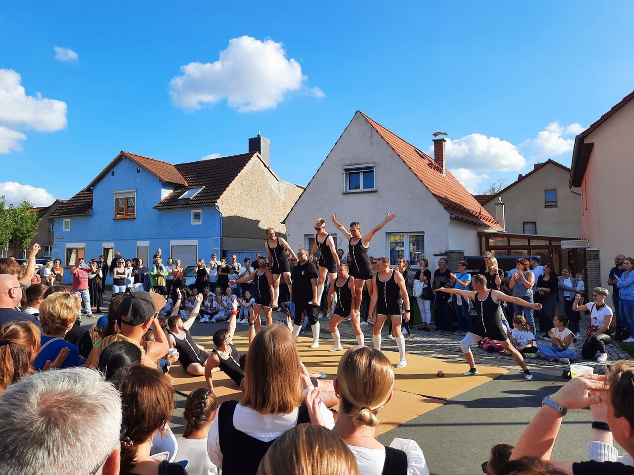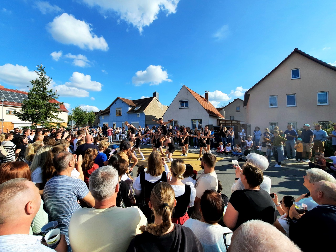 Eine Saalwette hat längst ihren festen Platz im Kirmes-Samstags-Programm. In diesem Jahr war der Verein gefordert, neun männliche Personen zu finden, die eine Choreographie der Gispi-Akrobaten nachturnen, deren Auftritte die diesjährige Kirmes bereicherten. Die Wette wurde gewonnen und Sebastian König freute sich über den Zusammenhalt der Elxlebener Vereine, aus denen sich die männlichen Laien-Akrobaten rekrutieren ließen, die dann am Sonntag einen furiosen Auftritt auf dem Schenksplatz boten.