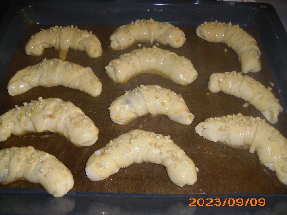 Hefe, Wasser, Salz, Zucker verrühren und 30 Minuten gehen lassen, restliche Zutaten untermengen, kneten, 2 Std. mindestens gehen lassen. Teig kurz kneten, in 2 Teile schneiden, jedes rund ausrollen, mit weicher Butter bestreichen, Gries darüber streuen, in Tortenstücke teilen, Nutellaklecks auf das breite Ende setzen, aufrollen, auf ein belegtes Blech legen, mit Eigelb/Kaffeesahne bestreichen und mit Mandelstücken bestreuen. Backen bei 175 Grad ca. 20 Minuten. Auskühlen lassen und beide Enden mit geschmolzener Schokolkade bestreichen.