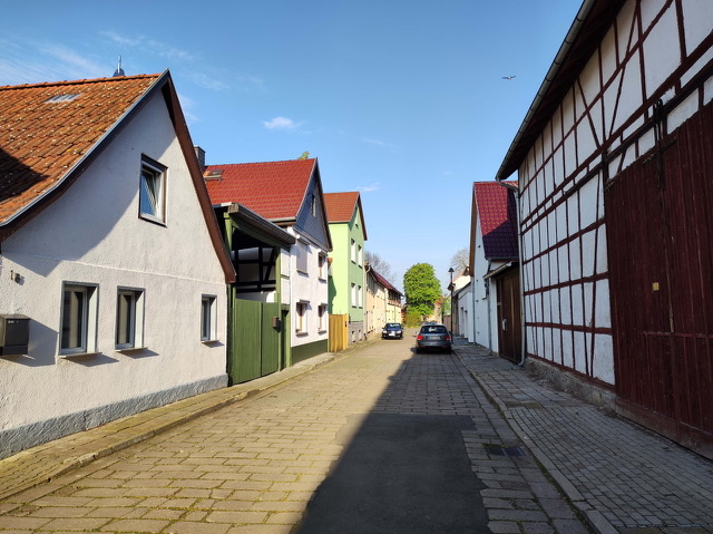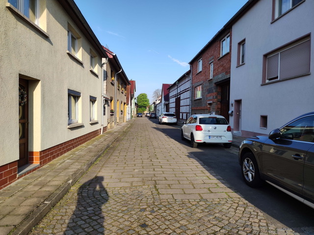 Der vormalige Zustand der August Bebel-Straße. Sie war 1989/90 in Aufbauleistung von den Anwohnern erneuert worden, gepflastert und Bordsteine verlegt.
