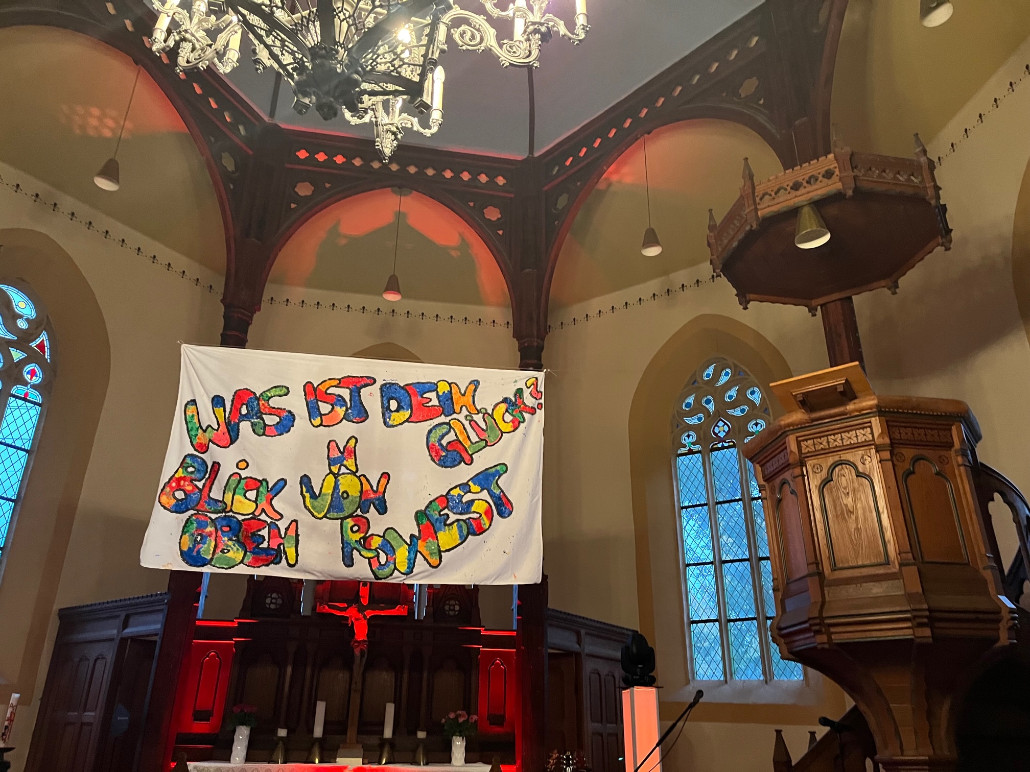 Ein Transparent wurde am Vormittag angefertigt, das schließlich während des Konzertes im Altarraum über den Köpfen der Profi- und der Kindermusiker schwebte mit Titeln von Christina Rommel. „Was ist Dein Glück?“ Und „Blick von oben“. Letzterer Titel wurde von den Kindern skandiert, als es um die Frage ging, welchen Titel sie am meisten mögen und von der Band hören möchten.