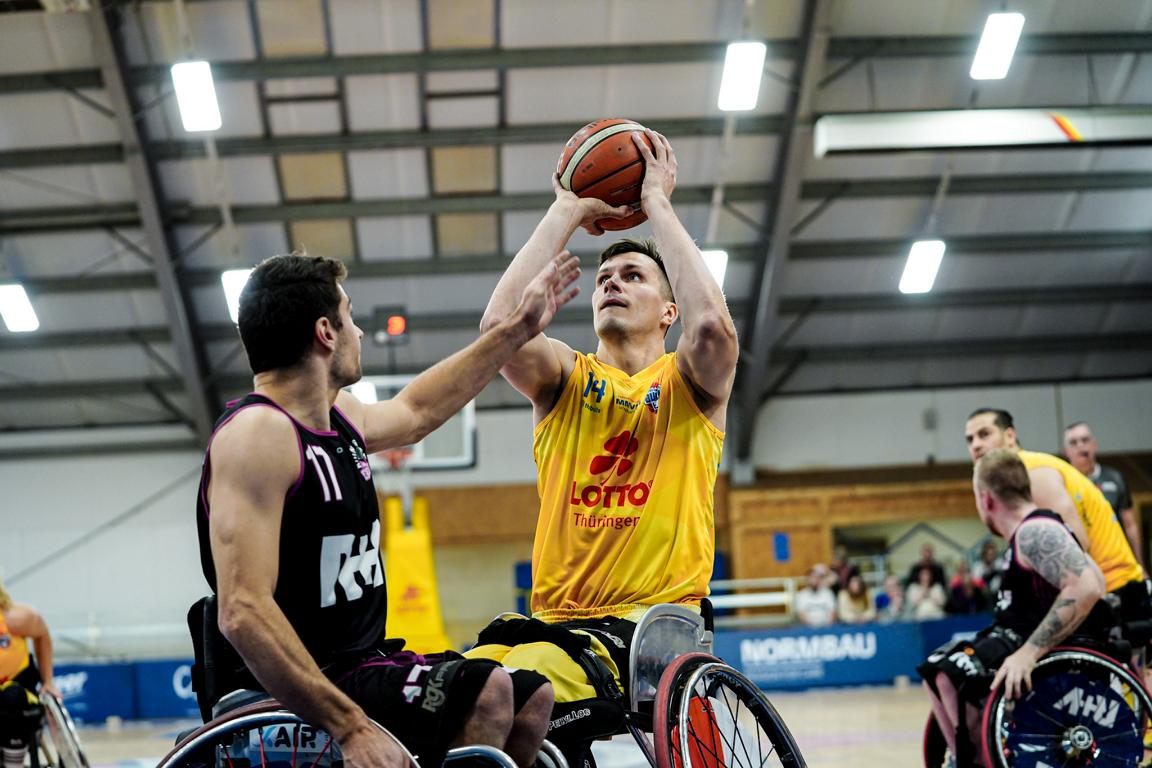 Eine Auszeit wurde für eine neue Besetzung und Strategie erfolgreich genutzt, dennoch gingen die Gäste aus Wiesbaden mit 17:16 in das zweite Viertel. Jetzt konnten die Thüringer ihre Schnelligkeit ausspielen. Angetrieben von einem überragenden Joakim Linden, der alle seine neun Wurfversuche in der ersten Halbzeit verwandelte, erhöhten vor allem einige Schnellangriffe das Punktepolster des amtierenden Deutschen Meisters. Auch die Defensive erstarkte. Als Lohn sprang eine 36:27-Halbzeitführung heraus.
