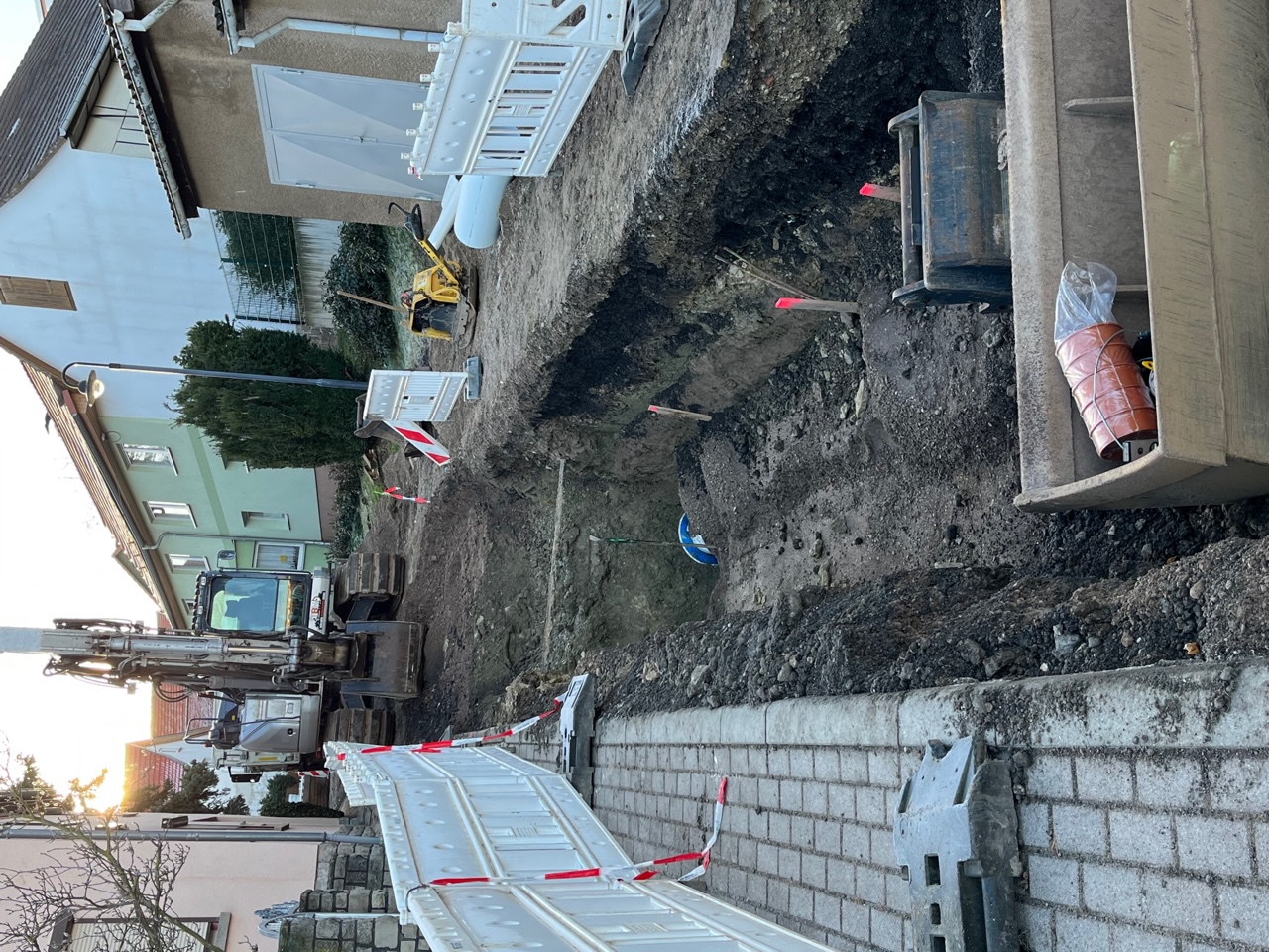 Die neue Wasserleitung ist verlegt, ebenso die Abwasser- und Regenwasserkanäle – jeweils getrennte Leitungen – sind auf rund der Hälfte des Straßenzuges fertiggestellt. Zuvor waren die Grundstücke noch nicht an das Kanalnetz angeschlossen, sondern die Eigentümer haben jeweils eine Klärgrube zu unterhalten.