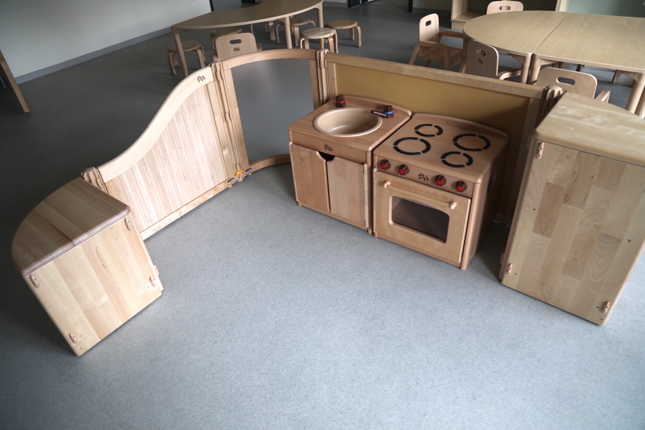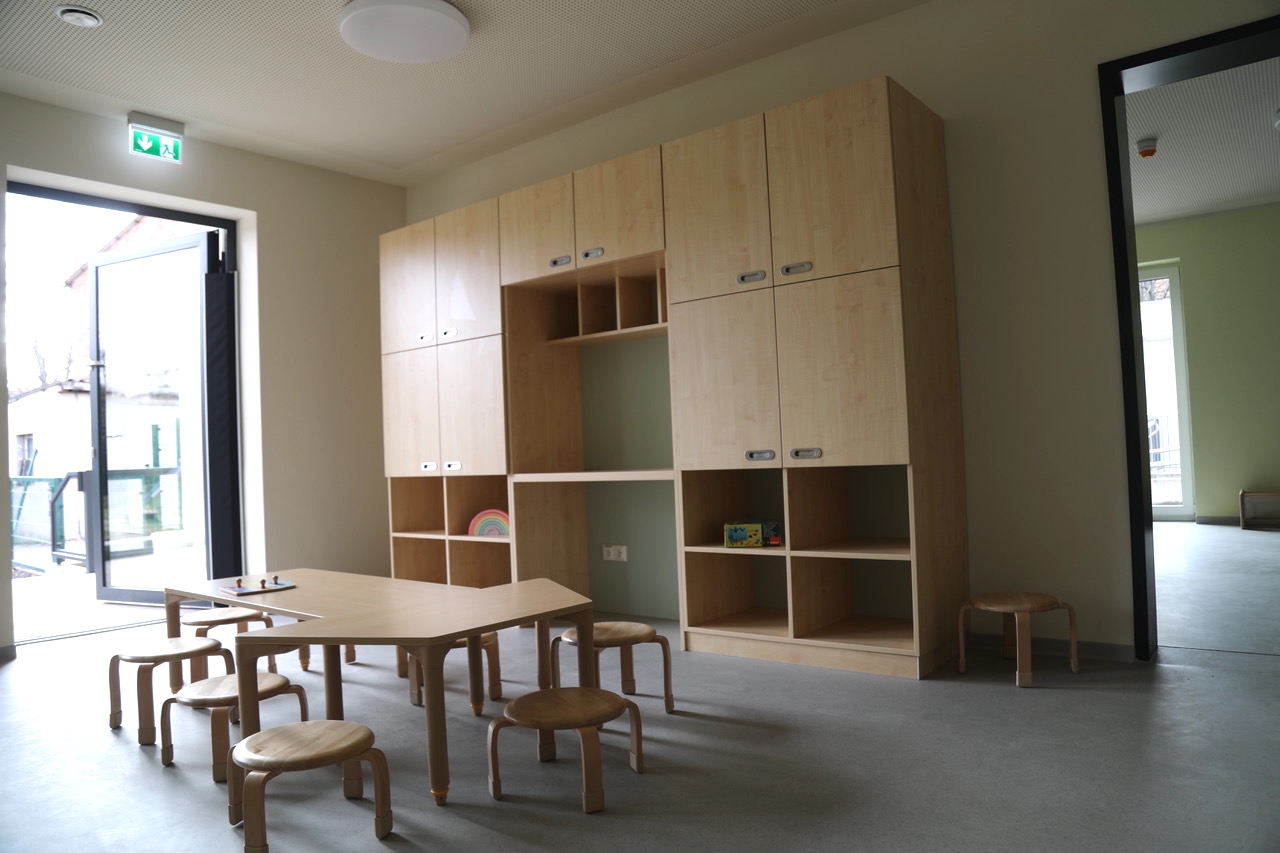 Die Möbel und Ausstattungsgegenstände sind bereits geliefert und größtenteils aufgebaut. Das Team der Kita präferierte hochwertige, schöne Holzmöbel und Spielgeräte. Sie lassen sich als modulares System leicht kombinieren und individuell zusammenstellen.