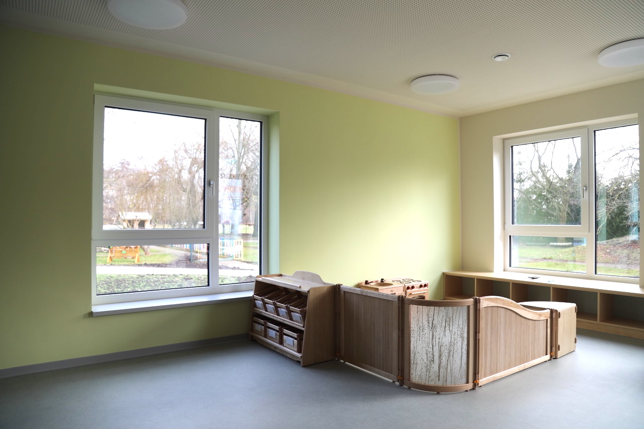 Rund 700 Quadratmeter offerieren 45 Kindern und acht Pädagogen ein üppiges Platzangebot. Geplant und gebaut wurde „entsprechend der neuesten Richtlinien – so, wie es für die Kinder am besten ist.“, erklärt Bauleiterin und Verantwortliche im ortsansässigen Bauamt, Jessica Pfannmöller-Cimino. Im Ergebnis stehen großzügig angelegte, lichtdurchflutete Räume.