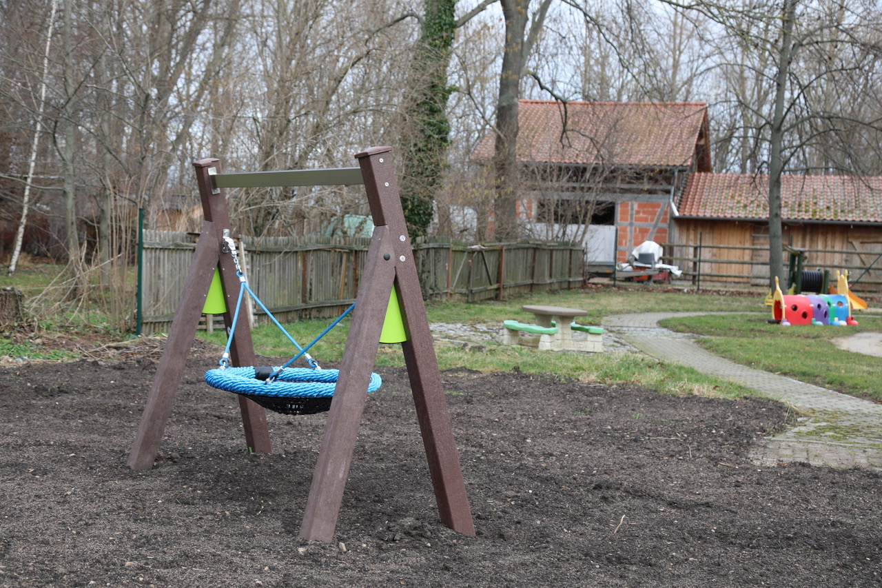 Neben einer kleinen Küche, gibt es auch einen Aufenthaltsraum für die Pädagogen. Ein Besprechungszimmer für Elterngespräche wurde geschmackvoll eingerichtet, dafür sorgte mit privatem Mitteln die stellvertretende Kita-Leiterin. Eine neue Nestschaukel im Außenbereich finanzierte der Kita-Förderverein. Hier wird in Kürze noch der Fallschutz eingebracht.