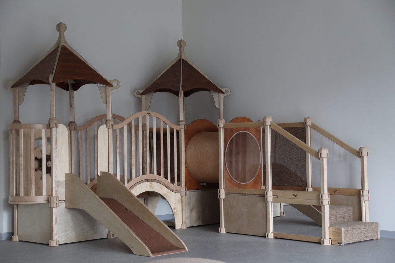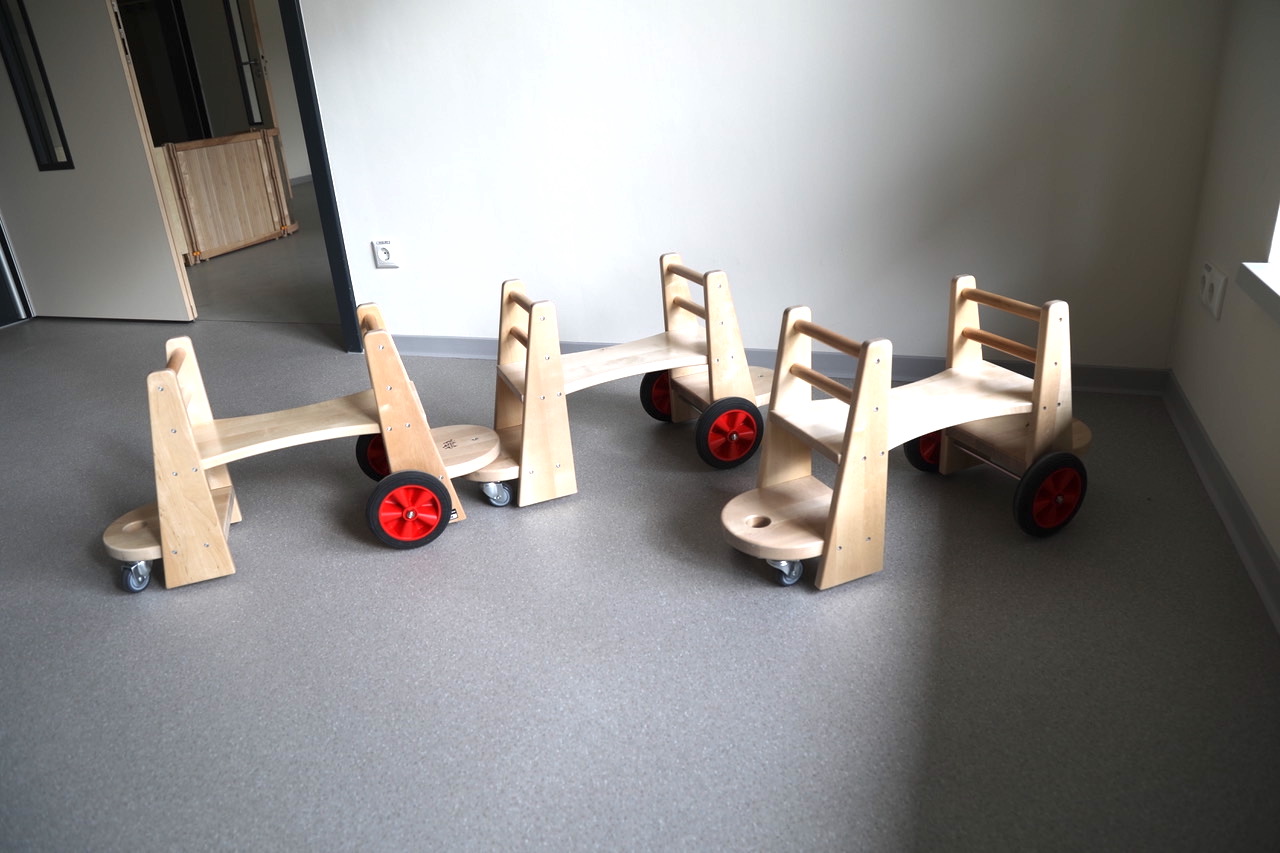 Bewegungsabläufe erlernen, krabbeln, klettern, rutschen, laufen über Wellen oder Bobby-Car (hier aus Holz) fahren – all das bietet der Bewegungsraum.