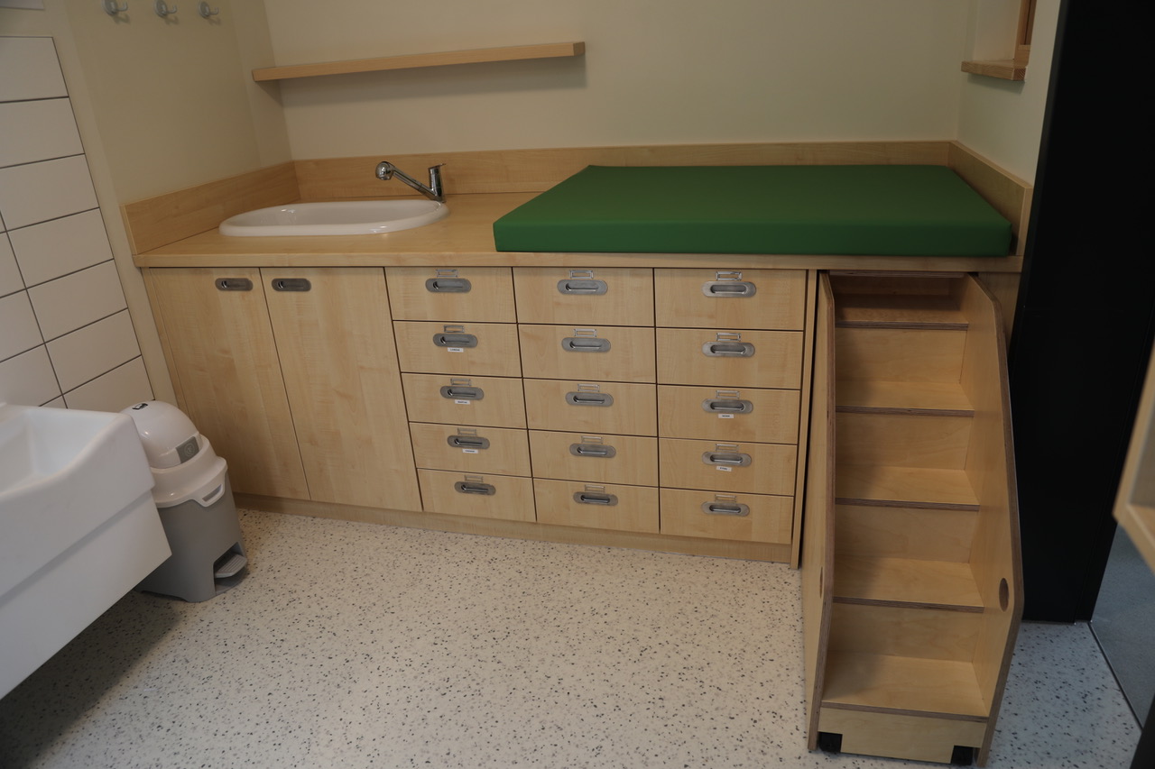 Es ist an alles gedacht: Die Babybadewanne mit separaten Wasseranschluss ist Teil der Wickelkommode – besser gesagt einer ganzen Wickelkombination, die auch mit einer herausziehbaren Treppe punktet, die von größeren Krippenkindern genutzt werden kann.