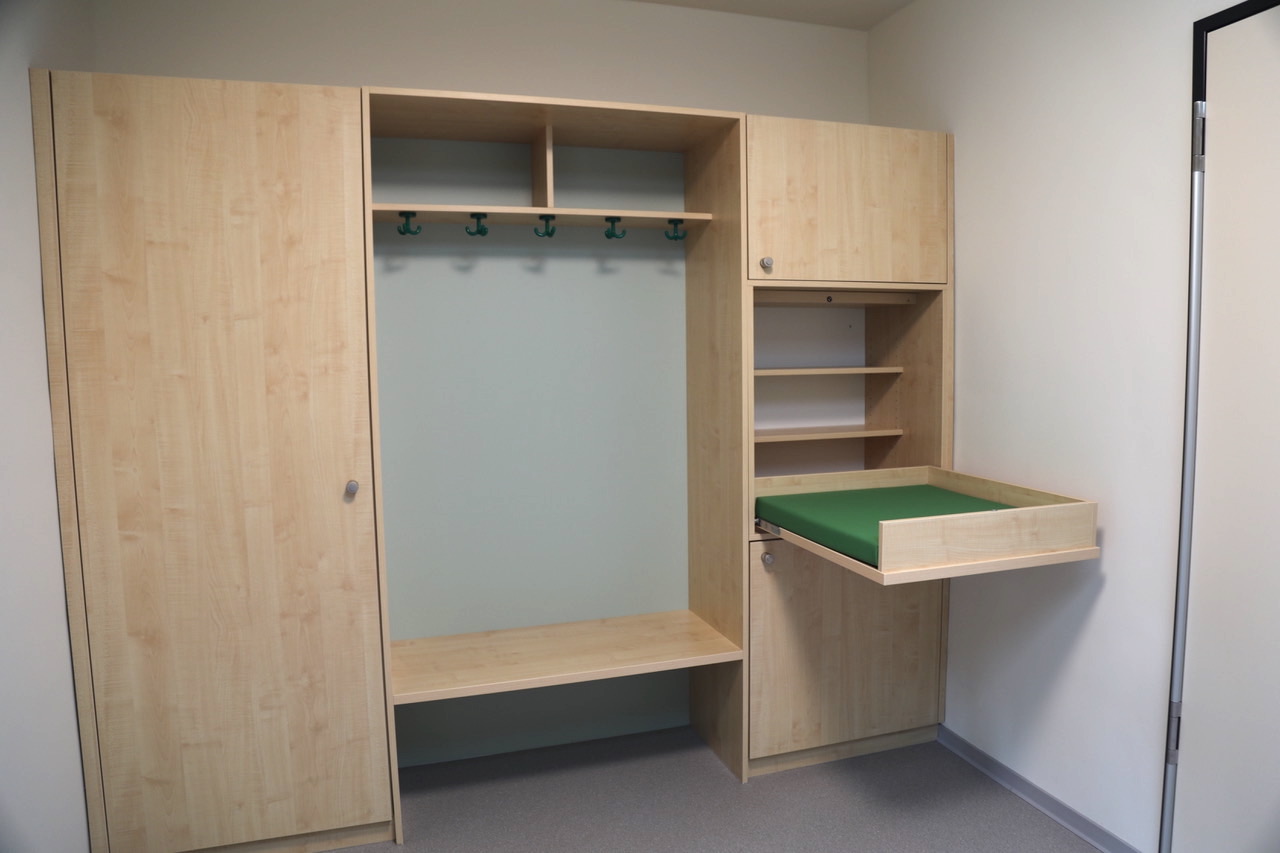 Für die Eltern wichtig: Den drei Gruppen- und drei Schlafräumen ist jeweils ein Garderobenbereich zugeordnet. Hier können nicht nur Kleidung und Schuhe gewechselt, sondern auch in guter Höhe die Kinder ggf. noch einmal gewickelt werden. Ein Raum steht für die Kinderwagen zur Verfügung.