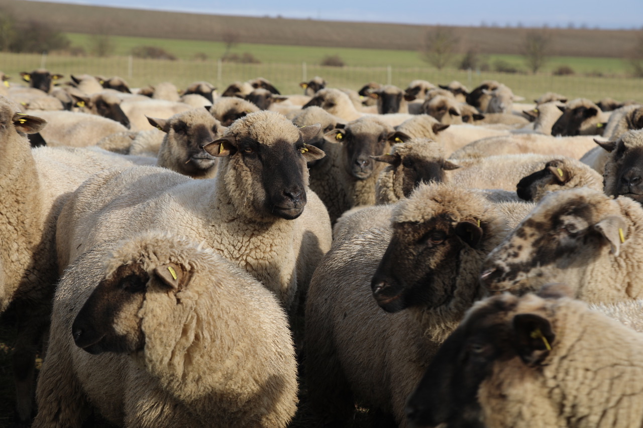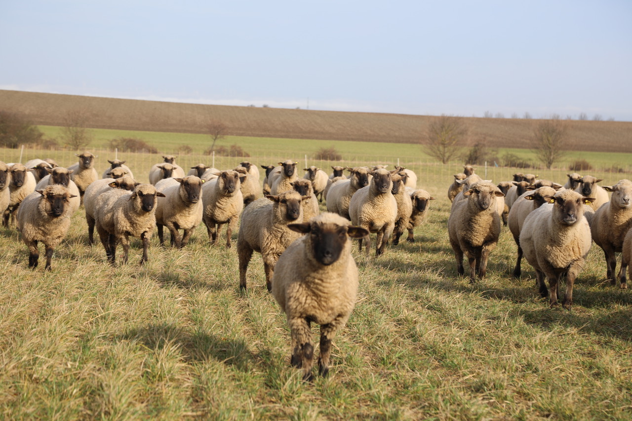Schwarzköpfige Fleischschafe mit kurzer Wolle und kräftigen Körpern