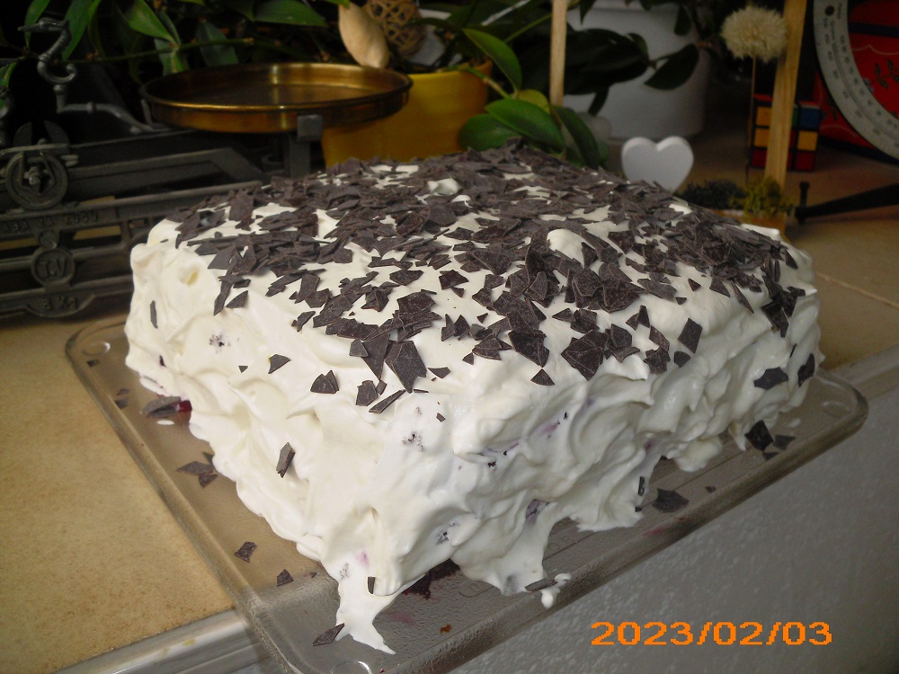 Sahne mit Zucker und Sahnesteif aufschlagen, Hälfte auf den Kirschen verteilen, zweiten Boden auflegen und mit der restlichen Sahne bestreichen, mit den Schokoraspeln oder Kakao dekorieren.