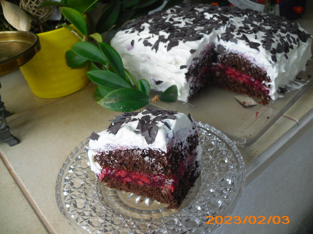 Füllung: 2 Gläser Sauerkirschen, 50g Zucker, 70g Speisestärke mit Wasser anrühren,  600ml Sahne, 3 Sahnesteif,