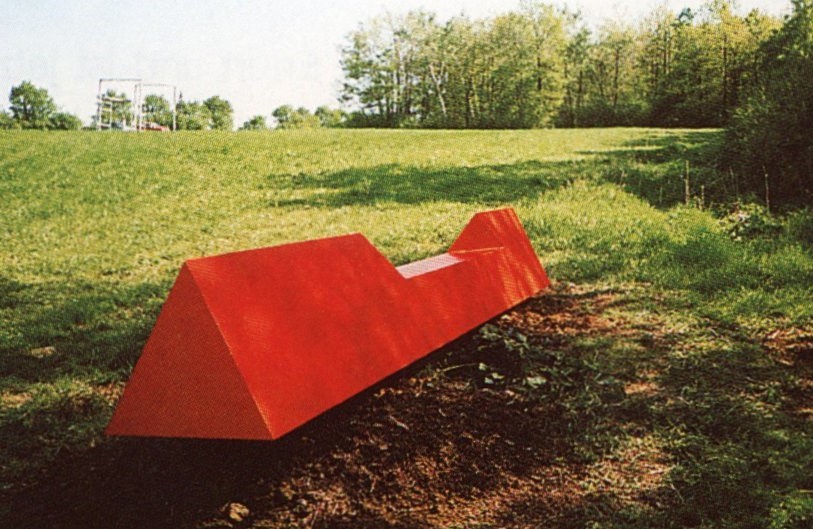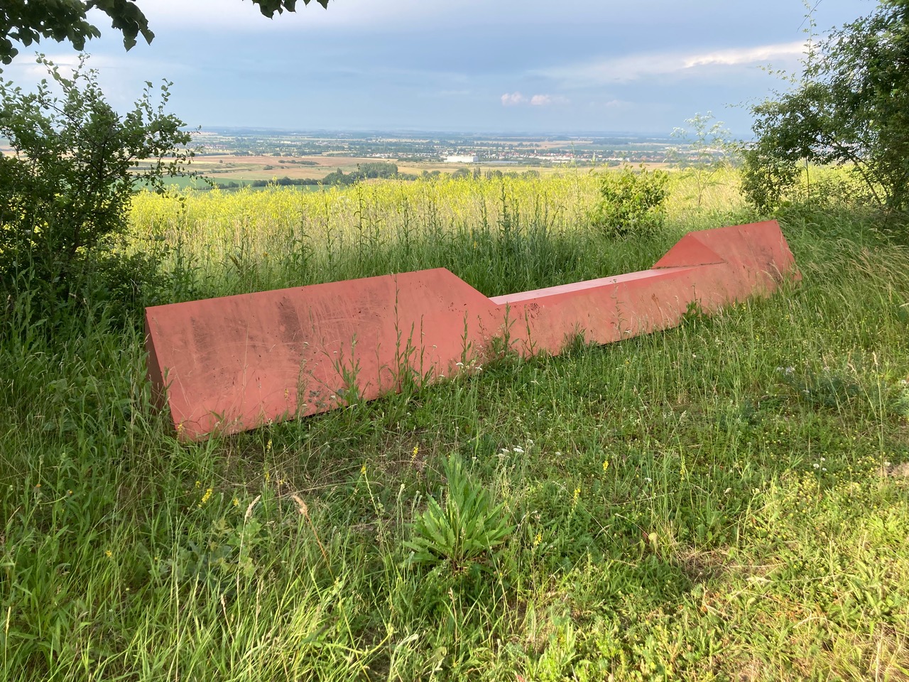 Eingebettet in den Wiesenrand scheint die rote, aus Indusriestahl geschweißte Plastik  durch ihre Form der Landwirtschaft zugehörig und erweist sich dennoch als eine Kunstform. Den Vorübergehenden bietet sie sich zum Sitzen und Verweilen an.