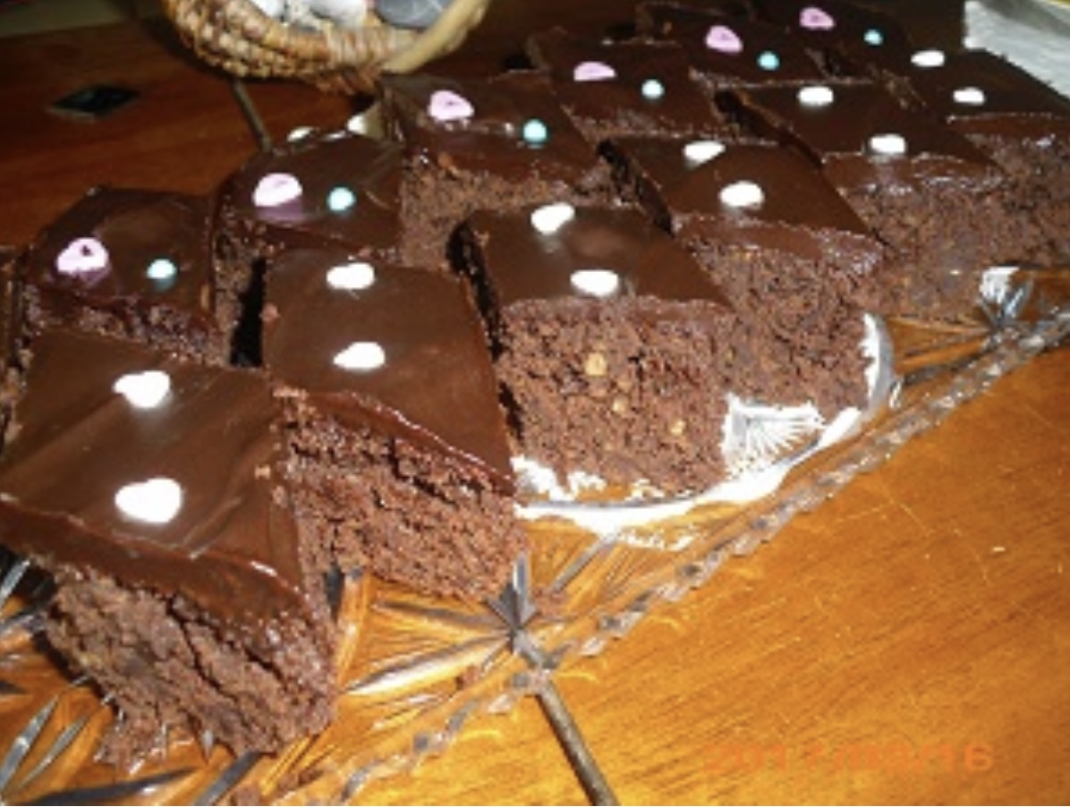 300g Mehl, 60g Kakao, 1 BP, 4g Salz, 1 gestr. TL Zimt, in einer Schüssel mischen, und löffelweise zufügen, dann 2 mittlere Zucchinis fein raspeln (ca. 350-450g, je nach der Größe der Zucchinis), 60ml Milch zufügen und 100g gemahlene Nüsse unterrühren, auf ein belegtes Blech streichen.