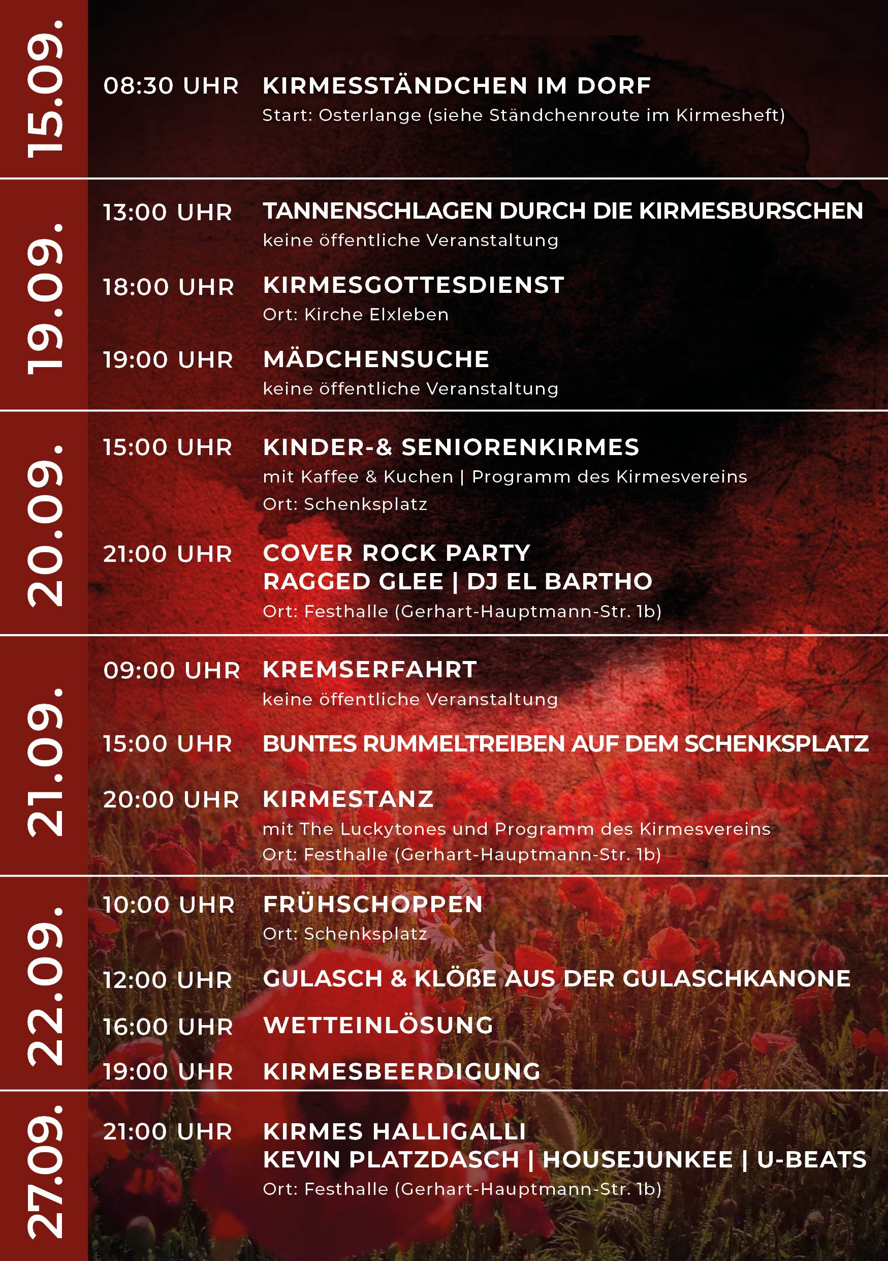 Auf den Kirmesgottesdienst am Donnerstag in der St. Michaelis-Kirche folgen die Kinder- und Seniorenkirmes am Freitag Nachmittag auf dem Schenksplatz und am Abend wird die Festhalle mit Rock-Klängen erfüllt. Am Samstag Abend ist – ganz in der Tradition – Kirmestanz mit Live-Musik.