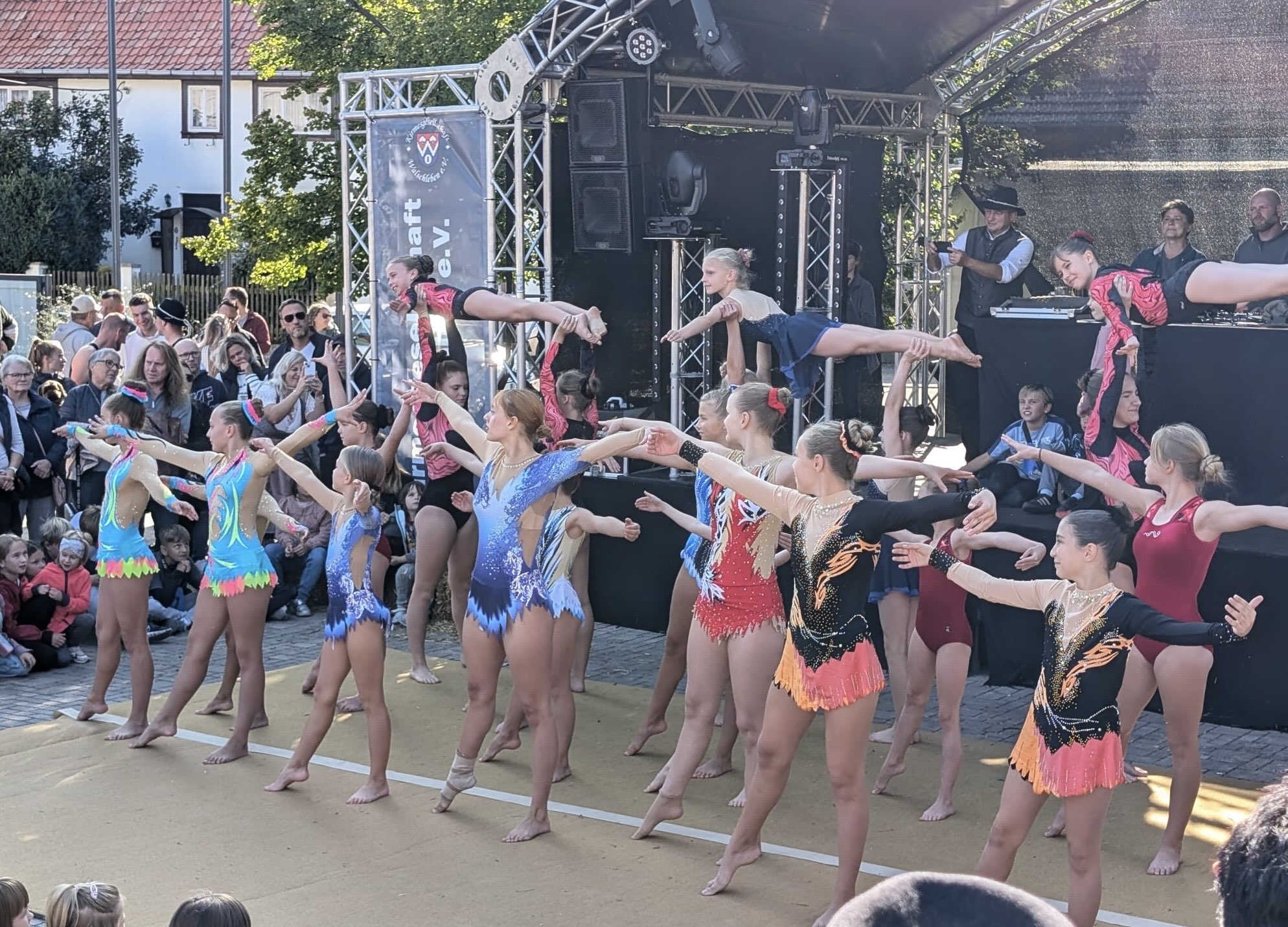 Nach diesen Kraftanstrengungen hat die Kirmesgesellschaft ihren stimmungsvollen Einmarsch, mit Vorführung ihrer Tänze, den vielen Gästen vorgeführt. Dann wurde der Plan zu einer Freiluftbühne für die Gispi Akrobaten umfunktioniert. Diese haben durch ihr musikalisches und artistisches Showprogramm die Walschleber zum Staunen gebracht.