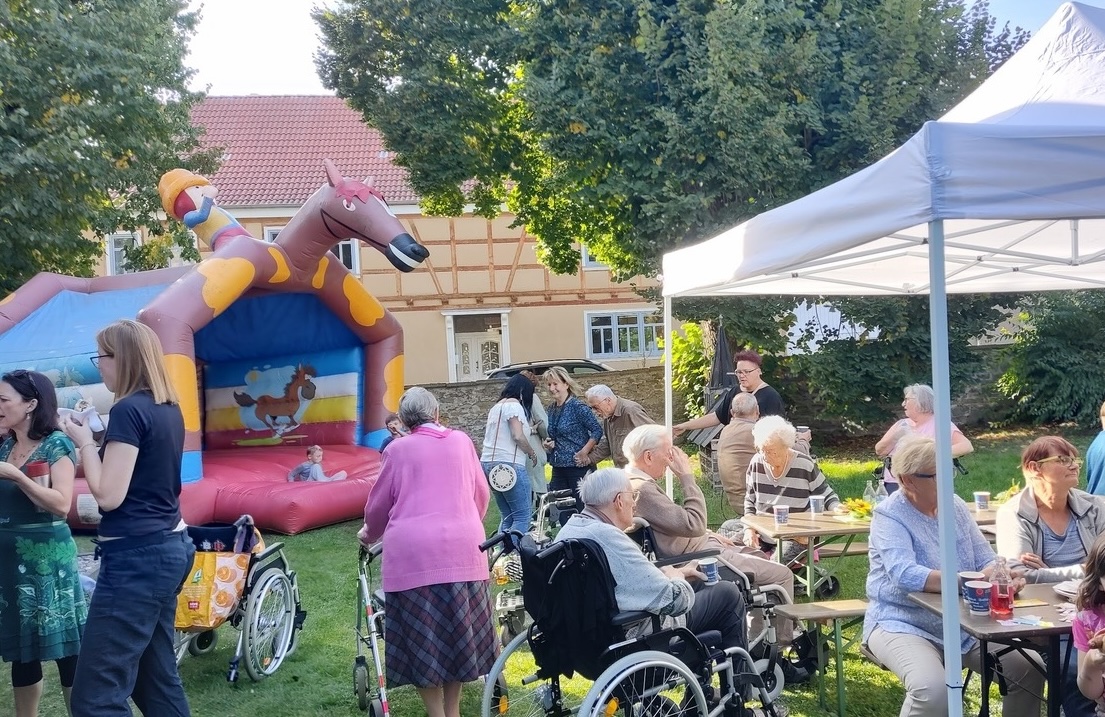 Im Anschluss saß man bei Kaffee und Kuchen gemütlich im Kirchgarten bei sonnigem Wetter. Für die Kinder gab es eine Hüpfburg. Später gab es Herzhaftes vom Grill.