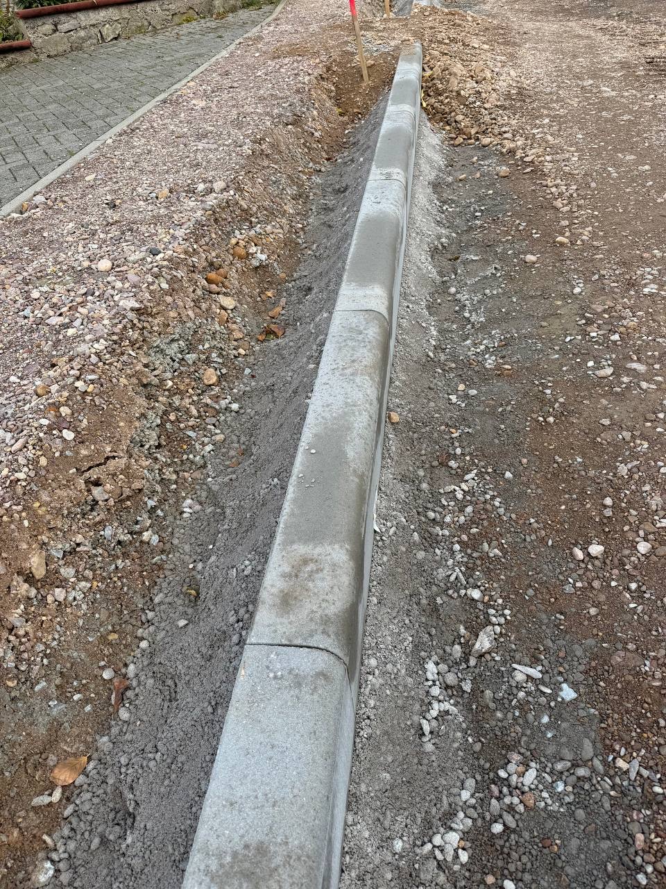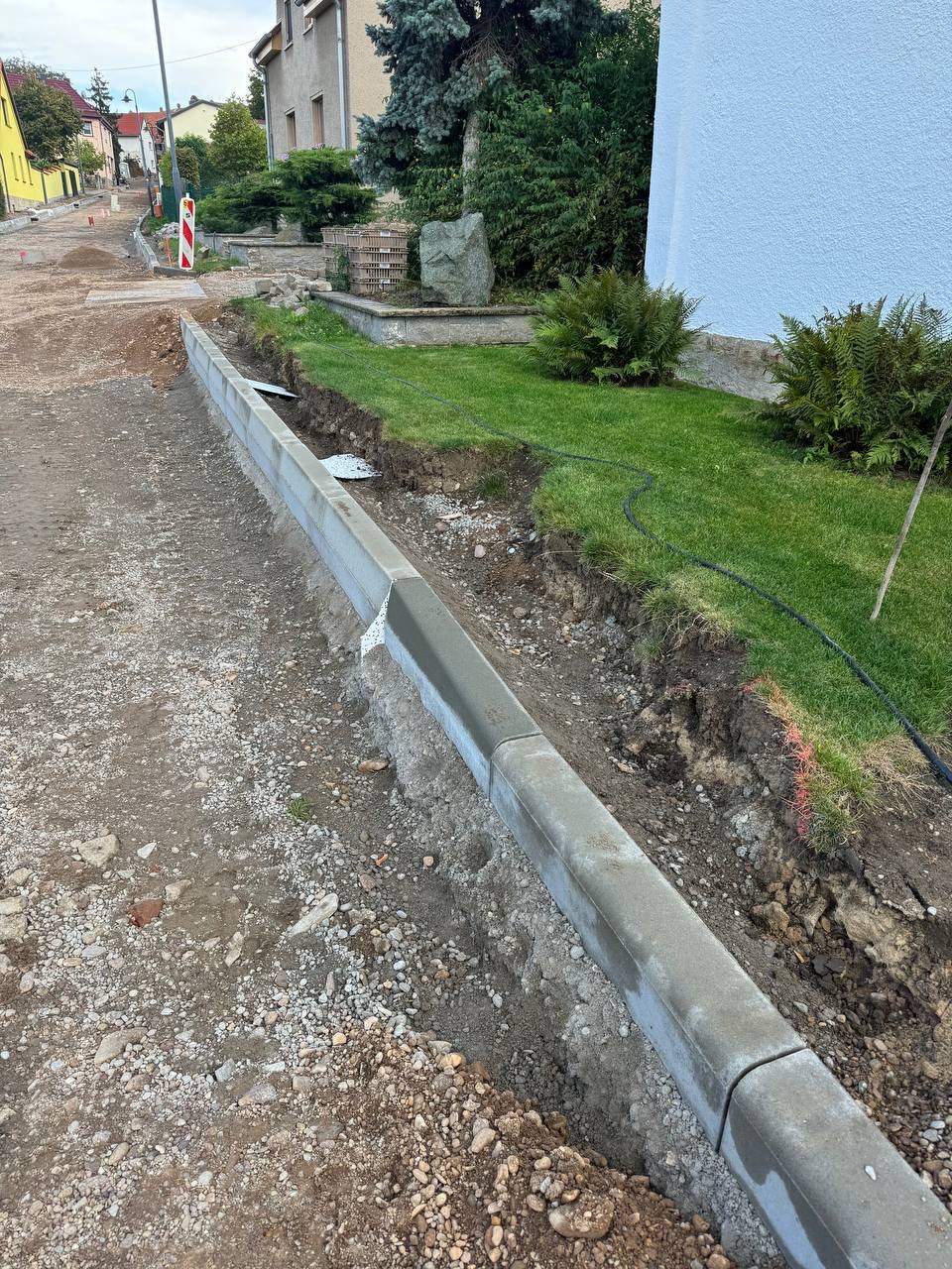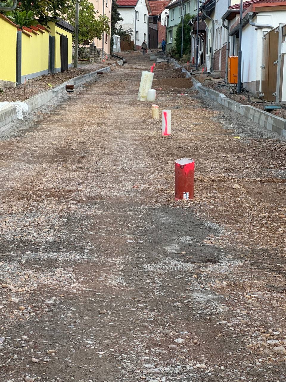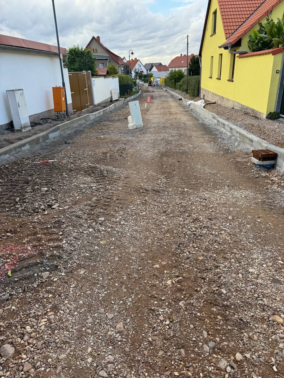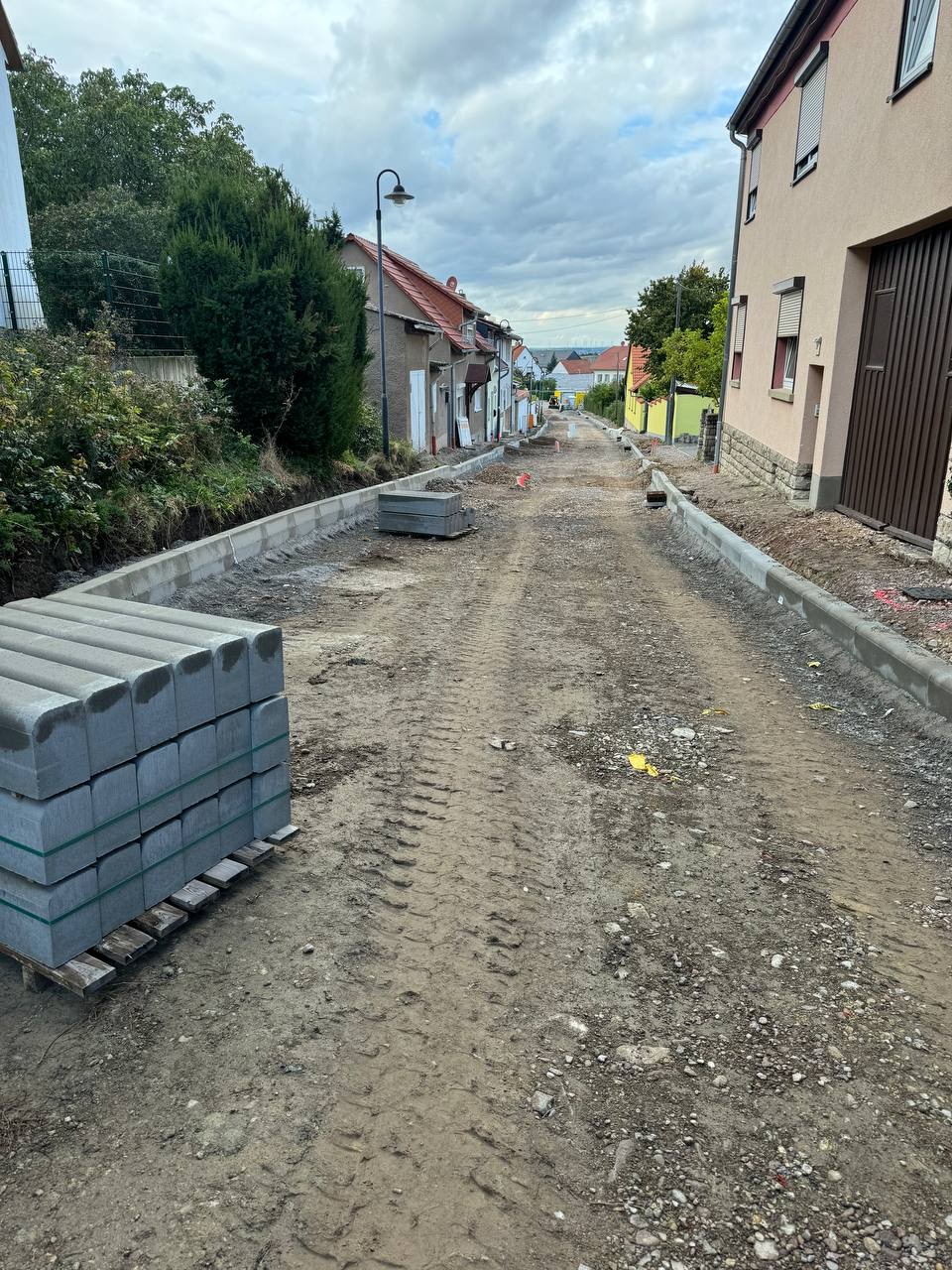Alle Leitungen sind verlegt, einschließlich der Leerrohre für schnelles Internet, die Grundstücke an die Kanalisation angeschlossen. Die Borde sind gesetzt. Der Unterbau der Fahrbahn und Gehwege ist bis auf die letzte Schicht erstellt. Gepflastert wird mit einem dreiformatigen Betonpflaster in Grau, die Zufahrten zu den Grundstücken in Anthrazit. Noch werden letzte vorbereitende Arbeiten ausgeführt, dann wird ab dem 14. Oktober die Fahrbahn asphaltiert. Rund eine Woche werden diese Arbeiten in Anspruch nehmen.