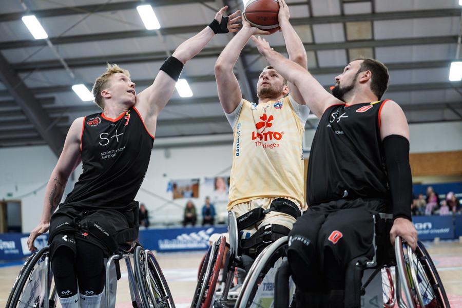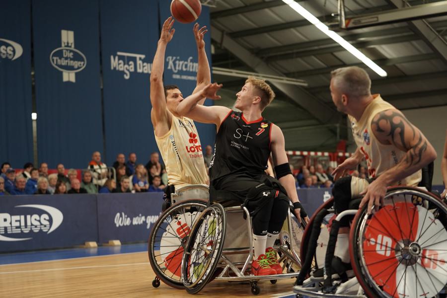 Auch im letzten Spielabschnitt gaben die Bulls nicht nach und spielten das Spiel mit gnadenlosem Druck zu Ende. Besonders Alex Halouski stellte sein Können unter Beweis mit Würfen aus großer Distanz. Er erzielte gleich vier „Dreier“ und brachte die Halle noch einmal richtig zum Beben. Auch Lukas Gloßner trug sich in die Scorerliste ein. Am Ende gewannen die Thuringia Bulls mit 109:34.