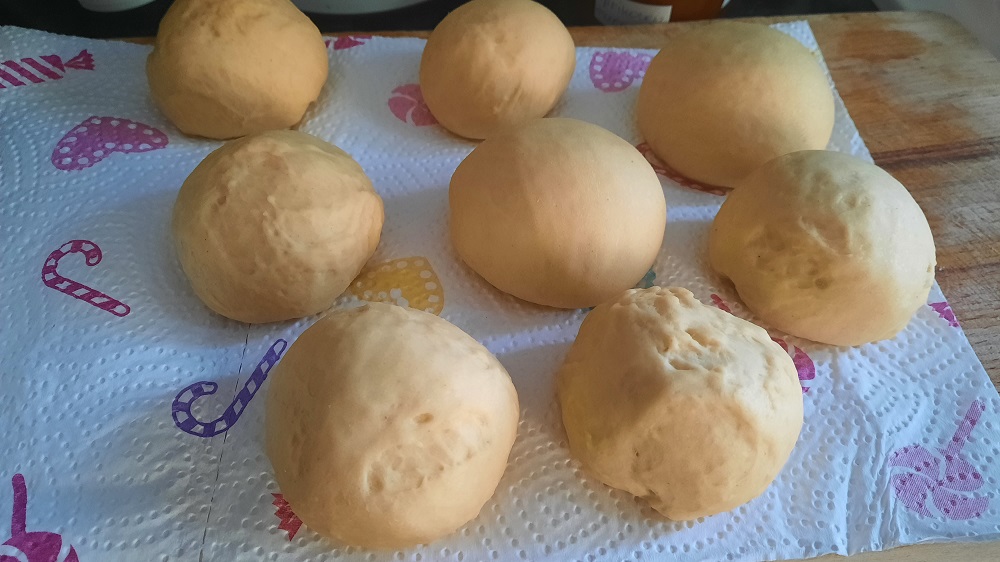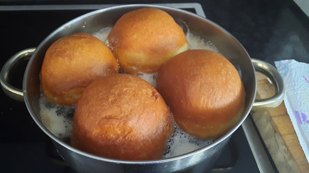 In Kugeln teilen, kurz kneten und dann auf ein kleines Stück Pergamentpapier setzen, ca. 20 Minuten gehen lassen, in Öl (nicht zu heiß, soll leicht Blasen werfen) jede Seite 3-4 Minuten ausbacken, abtropfen lassen, mit Marmelade füllen und in Zucker wälzen oder mit Zuckerguss beträufeln.