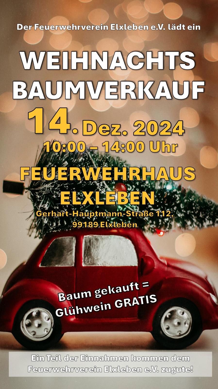 Eine Woche später, am 14. Dezember von 10 bis 14 Uhr, lädt der Feuerwehrverein an gleicher Stelle zum Weihnachtsbaumverkauf ein. Für jeden verkauften Weihnachtsbaum gibt es einen Glühwein gratis. Von der Einnahmen kommt ein Teil dem Feuerwehrverein Elxleben e. V. zugute.