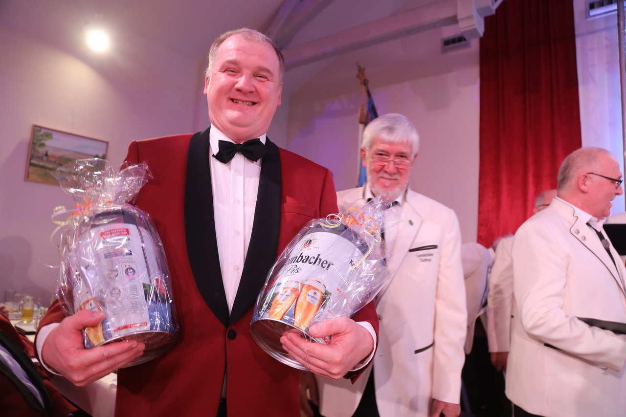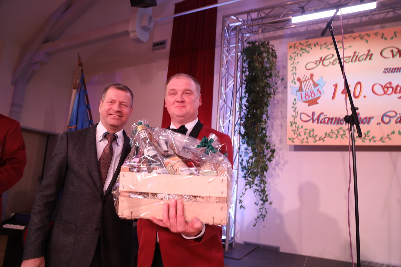 Für durstige Sängerkehlen überreicht Bürgermeister Renè Heinemann einen Präsentkorb.