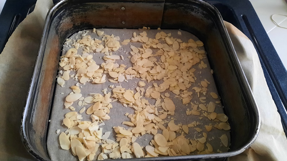 50g Mandelstifte unter den Teig auf den Boden der Springform streuen,