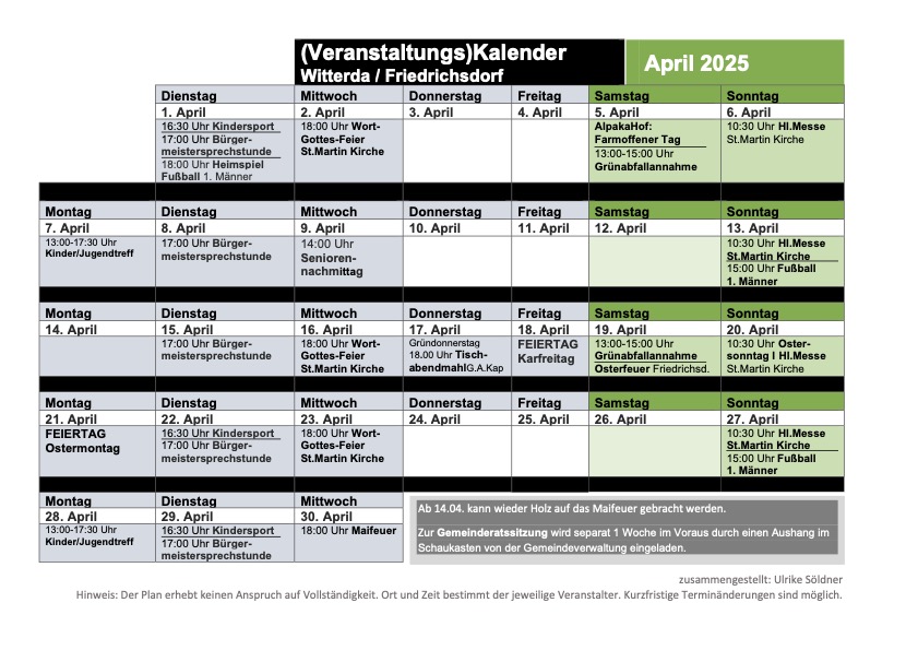 Sport, Maifeuer, Gottesdienste und vieles mehr