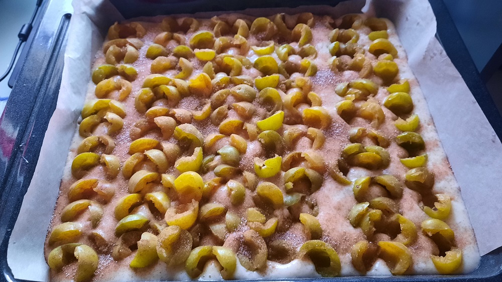 Teig: 4 Eier, 150g Zucker, 2Vanillezucker, 100g Öl, 100g  Wasser, 1 Essl. Zitronenkonzentrat (oder Saft und geriebene Schale ½ Zitrone), 300g Mehl, ½ Backpulver,
