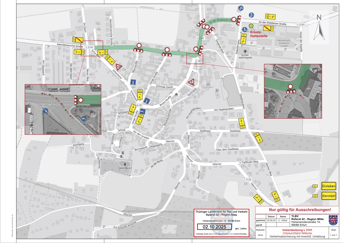 „Wegen Straßenbauarbeiten auf der L2141 Ortslage Witterda ab Abzweig Kapellenweg bis Abzweig Schenkstor, ist diese im Zeitraum vom 06.10.2025 bis 17.10.2025 voll gesperrt. Der Verkehr der L2141 wird über die L2141 Witterda - Kleinfahner - Gierstädt, L1027 Gierstädt - Großfahner - Döllstädt, B176 Döllstedt - Dachwig - Andislebener Kreuz, B4 Elxleben, L2141 Witterda und in die Gegenrichtung umgeleitet.