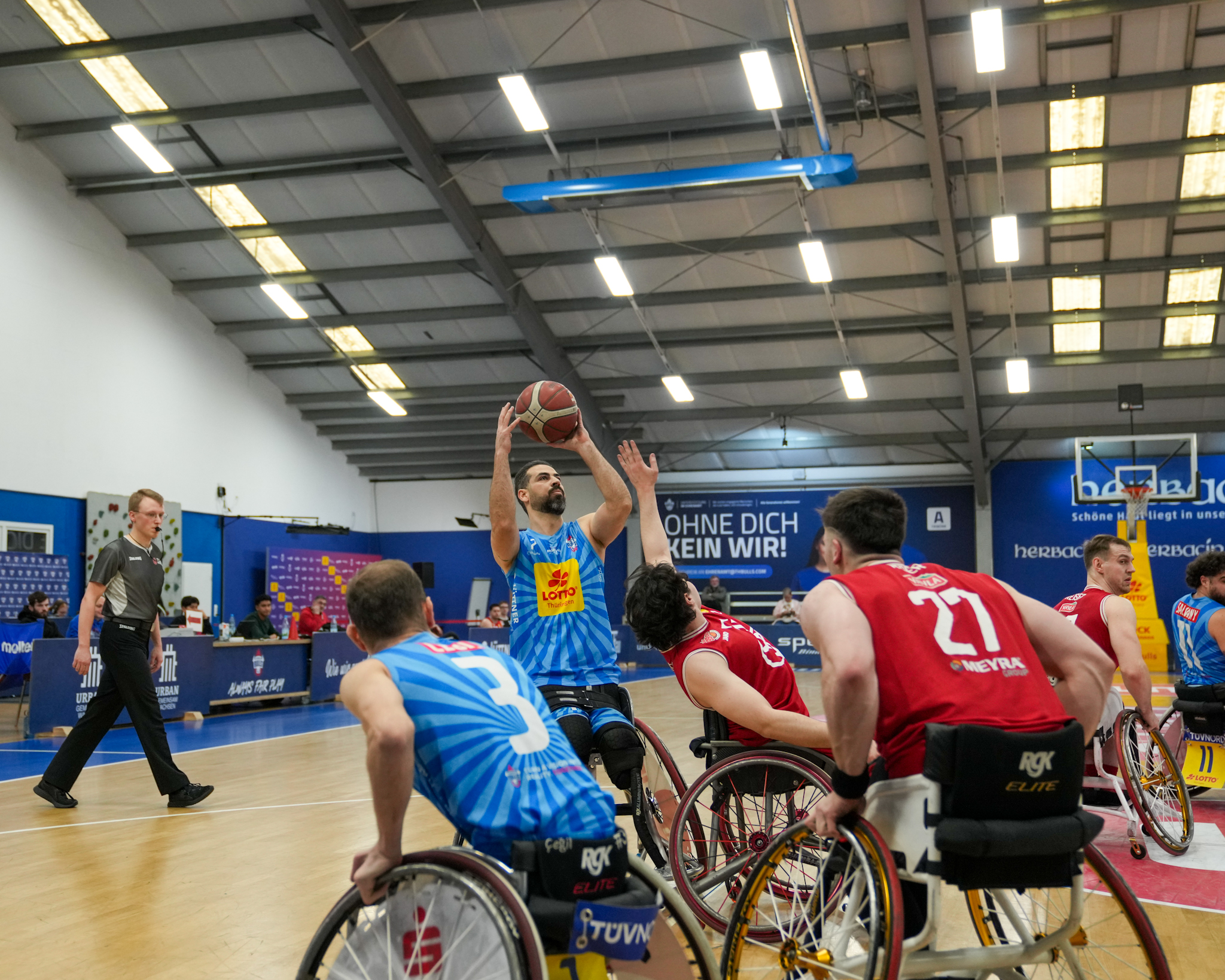 Das 2.Viertel präsentierte sich in einer ähnlichen Konstellation. Das THB-Team drückte mit einem gut aufgelegten Joakim Linden, der selbstbewusst zum 37:24 abschloss (13.Minute). Auf Kölner-Seite war es vor allem Bulut Kodal, der seine Größenvorteile geschickt einsetzte (39:27, 18.Minute). Dennoch behielten die Bullen zum großen Gong-Schlag mit 45:31 die Oberhand.