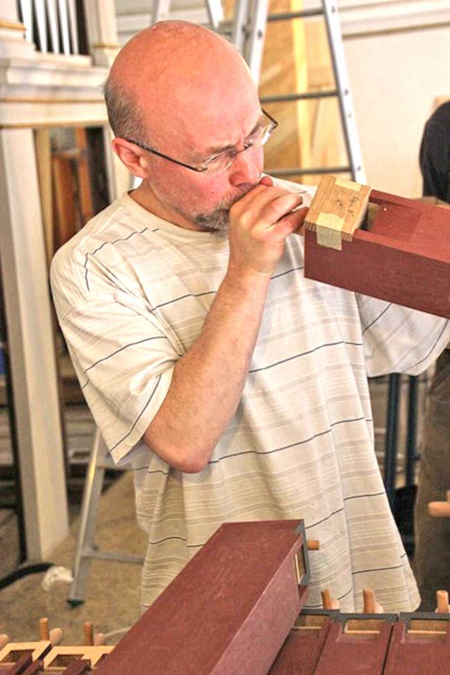 Wie genau intoniert wird, bleibt Orgelbaumeister Kutters gut gehütetes Geheimnis. Viel Erfahrung, eine systematische Herangehensweise und perfekt sitzende Handgriffe sind unabdingbare Voraussetzungen. Sein Ehrgeiz besteht darin, das beste Klangergebnis zu erzielen. „Dabei kämpfen wir um jeden einzelnen Ton.“, beschreibt er seinen hohen Anspruch. Wer den Orgelbauern zusieht, ist sicher, dass sich ihre Arbeit in bester Weise auf Klang der Orgel auswirken wird und ist voller Vorfreude auf klangvolle Konzerte.