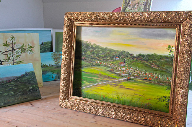 Auf langen Spaziergängen findet die Malerin die Motive für ihre Bilder, zudem arbeitet sie auch nach Auftrag. Oft sind es Menschen aus der Region, die ihr Haus, ihren Hof und Garten für sich und die Nachwelt festhalten wollen – oder weil sie die Erinnerung an ihren Heimatort wachhalten wollen, da sie schon vor Jahren weggezogen sind.