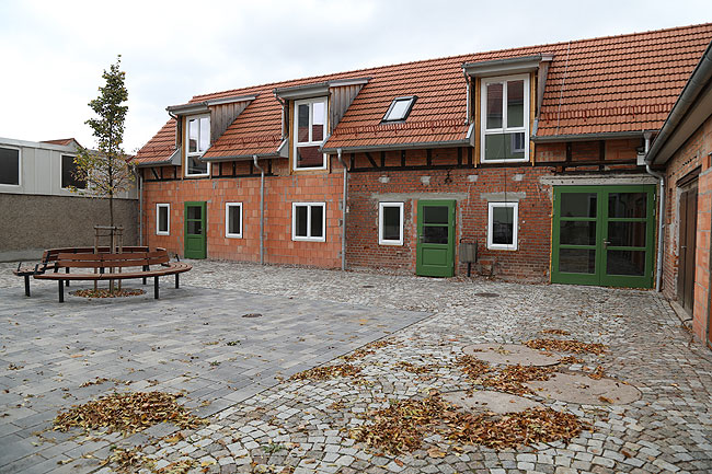 In der Mitte – ein schön angelegter Innenhof mit einer Linde, einer Baumbank, ins Pflaster eingelassenen Hülsen zur Aufnahme großer Sonnenschirme im Sommer. Das Ensemble wirkt sehr einladend und trotz des Herbstwetters lässt sich leicht erahnen, welch schönes Ambiente die Andislebener und ihre Gäste hier vorfinden.