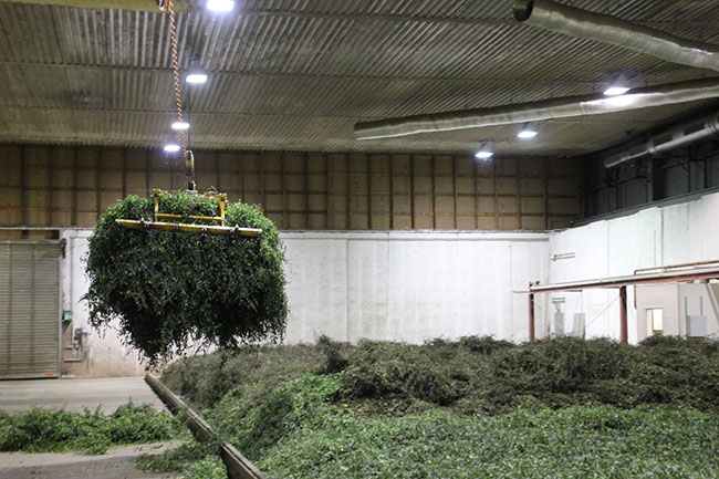 Nach der Ernte kommen die geschnittenen Pflanzen unverzüglich in die 2006 neu errichtete Trocknungsanlage. Als wir die große Halle betreten, treibt es mir die Tränen in die Augen, so stark ist hier die Mischung aus feucht-warmer Luft und ätherischem Öl. Es schein, als putze sie alle Schleimhäute und Atemwege sauber. Auf riesigen, 150 Quadratmetern großen Rosten, lagert hier die Minze. Über Kanäle wird 40 bis 45 Grad Celsius heiße Luft eingeblasen und an der Decke über ein Rohrsystem wieder abgesaugt. Das Ganze basiert auf einem Wärmepumpensystem, der Energieverbrauch bleibt also gering.