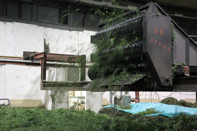 Per Kran wird die frisch geschnittene Minze auf die Roste aufgebracht.