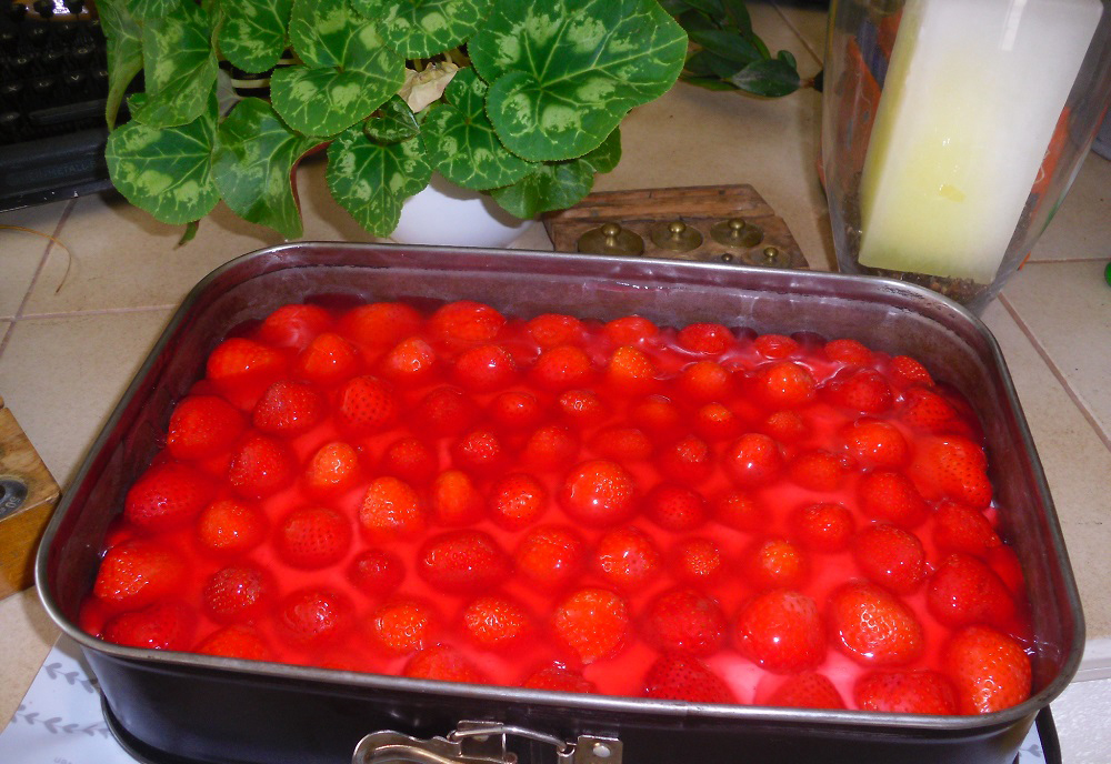 Den Frischkäse zugeben und glatt streichen. Die Crème auf den Boden streichen und belegen, Tortenguss nach Anleitung zubereiten und auf die Erdbeeren streichen, kalt stellen.