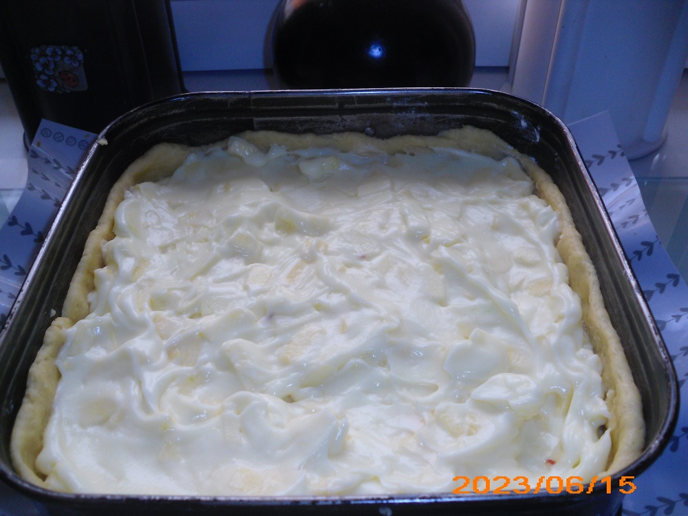 Einen Mürbteig kneten, in eine ausgelegte Form 24x24 drücken, dabei einen Rand hochziehen.