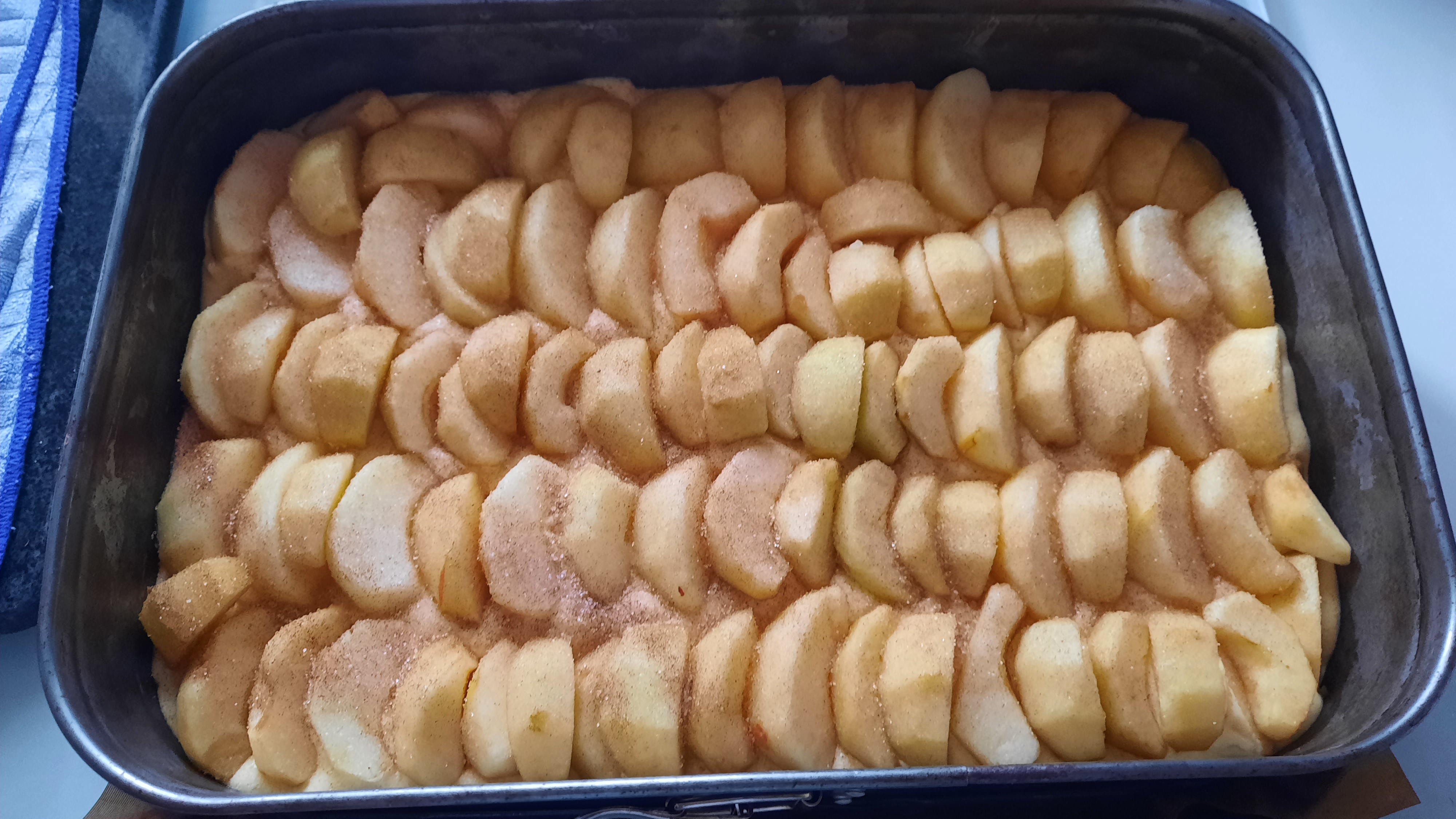 155g Zucker, 2 Vanillezucker, 250g Butter, etwas Salz, 250g Mehl, 2 Vanillepuddingpulver , 3 Eier, 155ml Milch, 1 Packung Backpulver, 3 große Äpfel