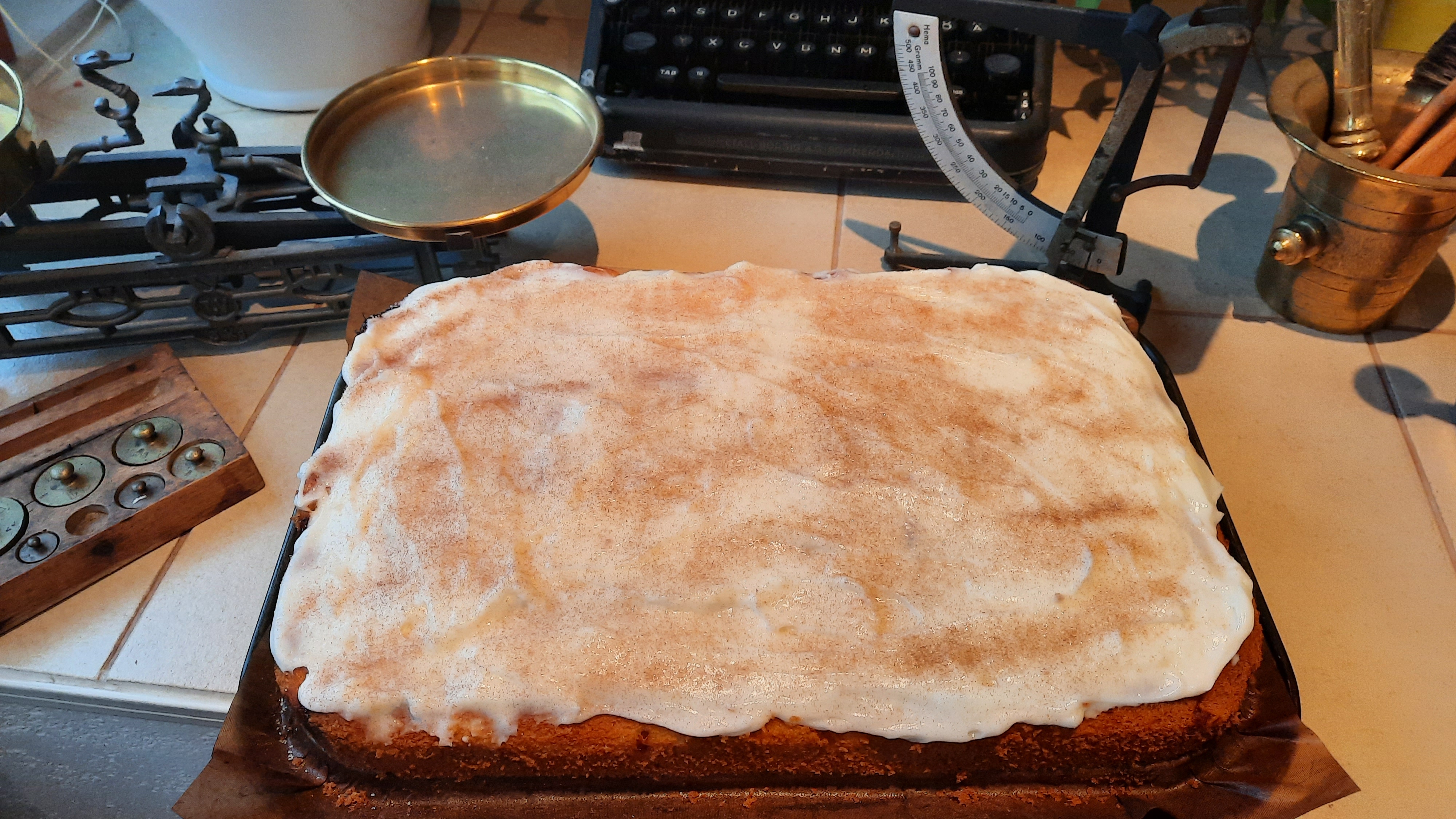 Einen Pudding kochen und das Palmin zum Schluss in den heißen Pudding rühren, auskühlen lassen, aufschlagen und 3 EL griechischen Joghurt einrühren, evtl. etwas Zucker zugeben, auf den Kuchen streichen und mit Zimt/Zucker bestreuen.