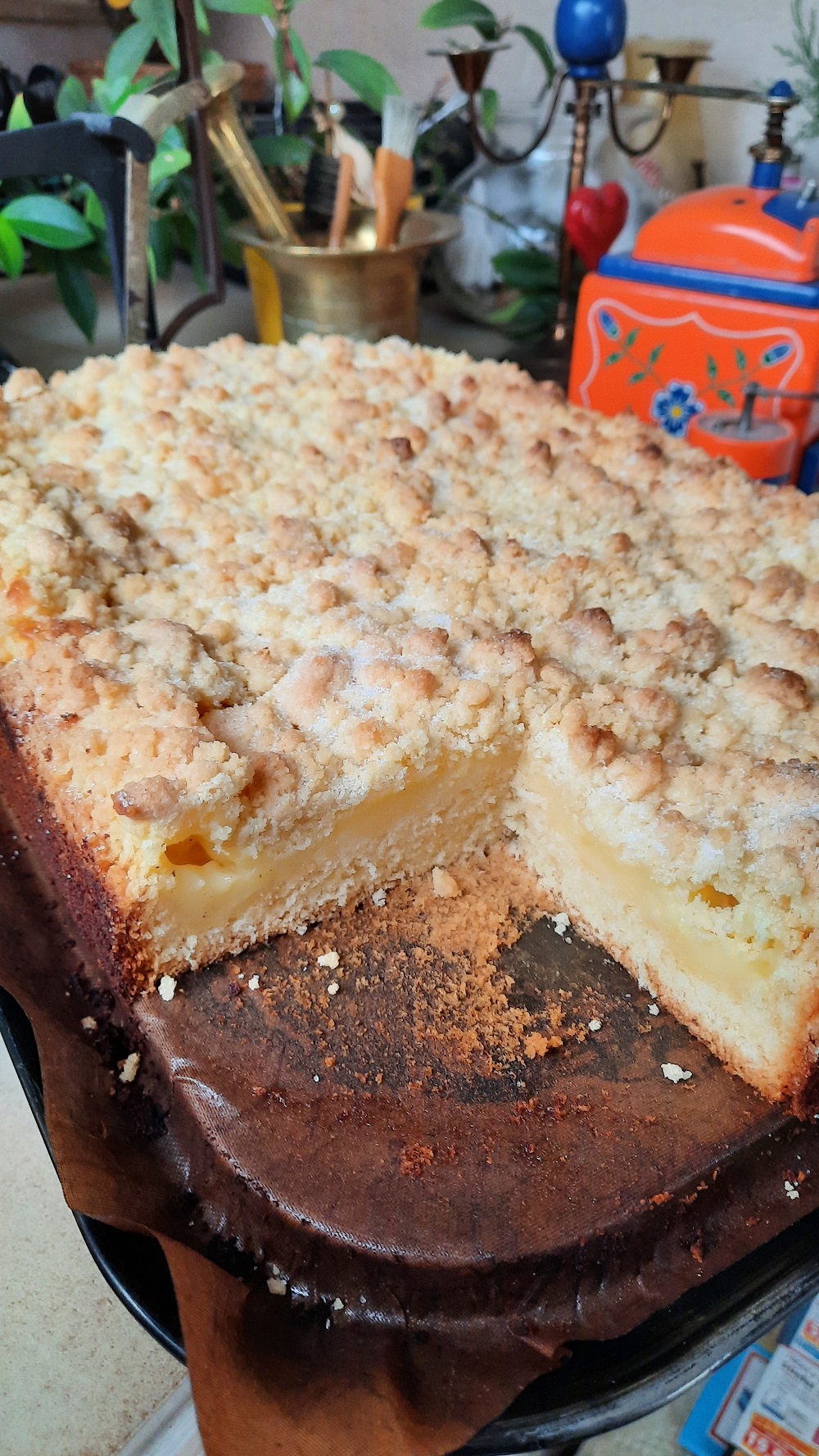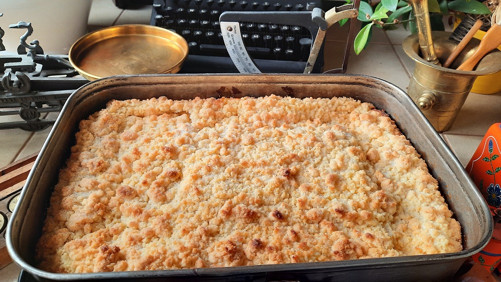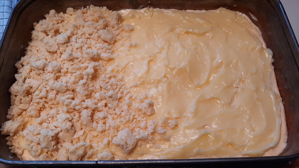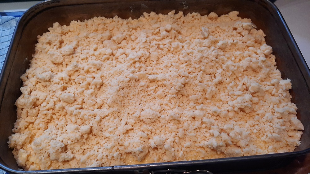 Streusel: 250g Mehl, 140g Zucker, 170g kalte Butter Streusel kneten und auf den Pudding streuen.