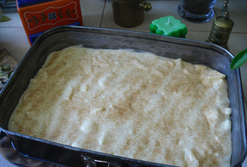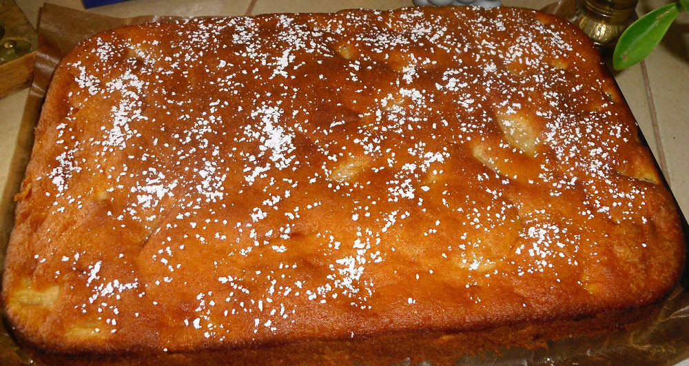 Einen Rührteig herstellen, in eine ausgelegte Tortenform streichen, 3 Äpfel in Scheibchen schneiden und 1EL Zitronensaft darüber träufeln, auf den Teig legen, optional kann man mit einem Teelöffel kleine Häufchen geschnittener Äpfel auf dem Kuchen verteilen, mit Mandeln oder Zimt/Zucker bestreuen, backen bei 175 Grad ca. 30-35 Minuten.