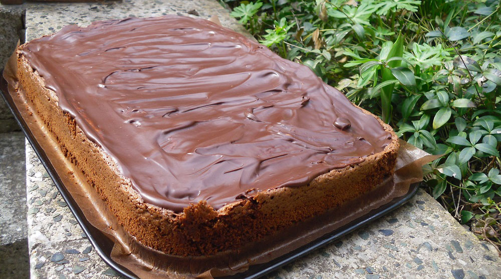 Teig in eine ausgelegte Form 25x35cm streichen und backen bei 175 Grad 40-45 Minuten, abkühlen lassen.